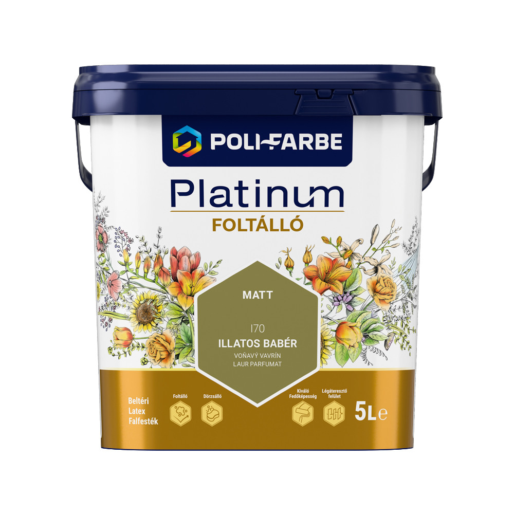 A Poli-Farbe Platinum Foltálló beltéri latex falfesték Illatos babér I70 színben, 5 l kiszerelésben cement, mész-cement és gipszhabarcs, tégla, gipszkarton, glettelt felület, festhető tapéta és korábban diszperziós festékkel festett falak és mennyezetek dekoratív és védő festésére alkalmas. Ideális nagy igénybevételű helyiségekhez.